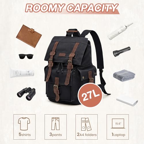 | description | 【DURABLE & WEAR-RESISTANCE】: Kattee men’s leather canvas backpack made of weave heavy-duty plain-woven fabric and decorative buckles that feature high-efficiency magnetic button closures. The rucksack backpack is made of a combination of canvas and leather providing both durability and style 【LARGE CAPACITY】: This canvas backpack for men is perfect for those who need to carry a lot of items on a daily basis. Its large capacity provides ample space for storing portable textbooks A4 magazines and other essentials. The interior includes a roomy 15-inch main pocket as well as a pocket that can fit a 17-inch laptop 【PRACTICAL & COMFORTABLE】: The canvas and leather backpack features multiple compartments and pockets providing ample space for organization and easy access to essentials such as phones wallets and keys. Additionally the adjustable straps ensure comfortable carrying making it easy to take on the go 【VERSATILITY & MULTI-PURPOSE】: This canvas rucksack backpack is perfect for hiking camping and traveling but also serves as an ideal school bag for college students. Additionally the adjustable straps ensure comfortable carrying making it easy to take on the go. Whether you need a rucksack for daily use or for a special occasion this large canvas backpack offers both practicality and style 【On Going Support:】: If you have any questions quality issues please do not hesitate to contact us. We are dedicated to providing the best possible solution and ensuring your satisfaction with our product Color:Black |