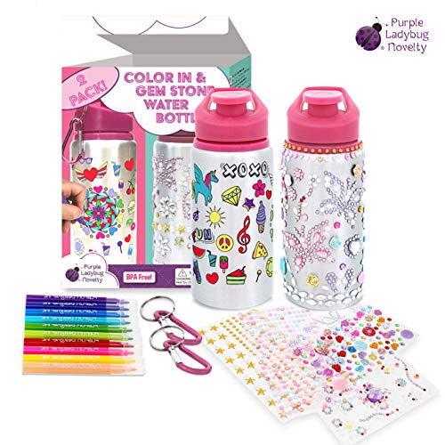 Title: Purple Ladybug Water Bottles Set for Girls - 1 Decorate Your Own Glitter Gem Water Bottle with Rhinestone Stickers +1 Color Your Own Kids Water Bottle with Bright Markers! Cute Gift Fun DIY Craft Kit