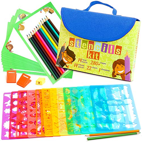 Title: Stencil Drawing Kit for Kids w/Carry Case - 54 pcs. w/ 280 Stencil Shapes and Colored Pencils - Arts and Crafts for Home Travel - Fun Creative STEM Toy for Girls and Boys Ages 3 to Teen - Blue