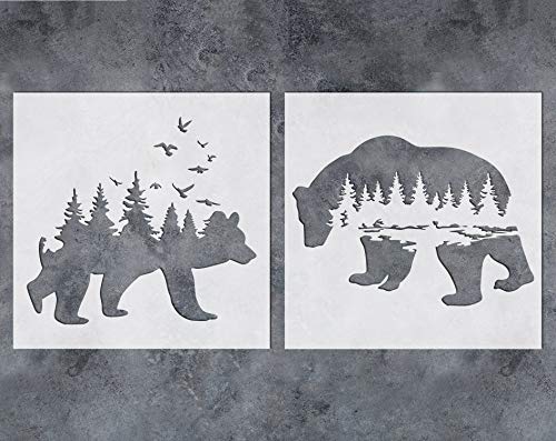 Title: GSS Designs Mountain Forest Bear Stencil (2 Pack) - Reusable Stencil for Walls (12x12Inch) - Art Painting for Wall Canvas Furniture Cards Decor (SL-060)