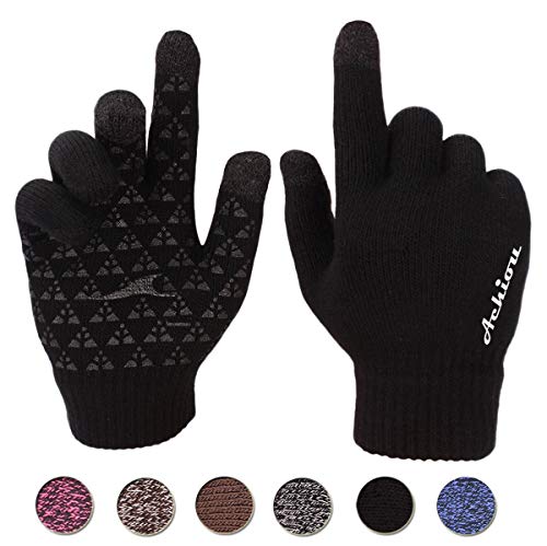 Title: Achiou Winter Knit Gloves Touchscreen Warm Thermal Soft Lining Elastic Cuff Texting Anti-Slip 3 Size Choice for Women Men - Color: Black