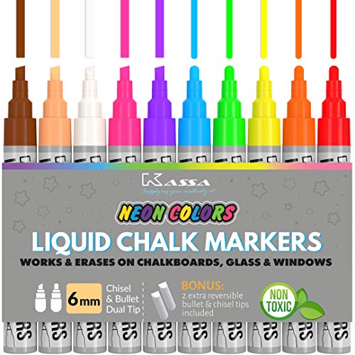 Title: Kassa Liquid Chalk Markers for Blackboards (10 Neon Colors) - Chalkboard Marker Erases on Glass Window Black Board Mirror - Chalk Pens Include Reversible Chisel & Bullet Tip - Non-Toxic Ink - Size: 6mm Tip