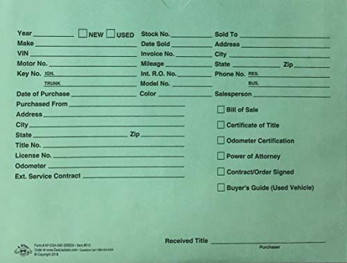 Title: Vehicle Deal Envelopes Deal Jackets (100/pack) (Green) (W4)