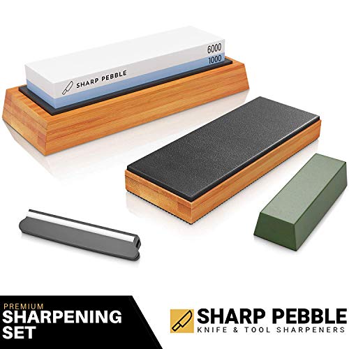 Title: Sharp Pebble Complete Sharpening Stone Set- Dual Grit Whetstone 1000/6000 - Bamboo Leather Strop - Waterstone Knife Sharpener with Non Slip Bamboo Base Angle Guide & Green Polishing/Honing Compound