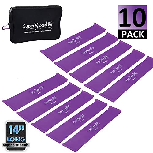 Title: Super Exercise Band USA 14' x 3' Extra Long Latex Free Mini Loop Bands in 3 5 10 Pack Sets. 10 Strengths for Resistance Training Stretching Yoga Pilates Toning. Plus E-Book and Zipper Carry Bag. Color:q. Purple HEAVY+ Loop Band 10 Pack