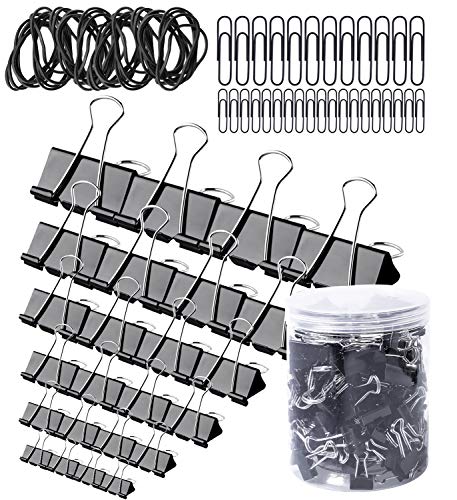 Title: 220 Pcs Binder Clips Paper Clips and Rubber Bands Set - Paper Clamps Assorted 6 Sizes Paper Binder Clips Metal Fold Back Clips with Box for Office School and Home Supplies Black